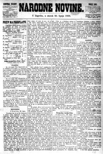 Narodne novine : 34,143(1868) / odgovorni urednik Ljudevit Gaj.