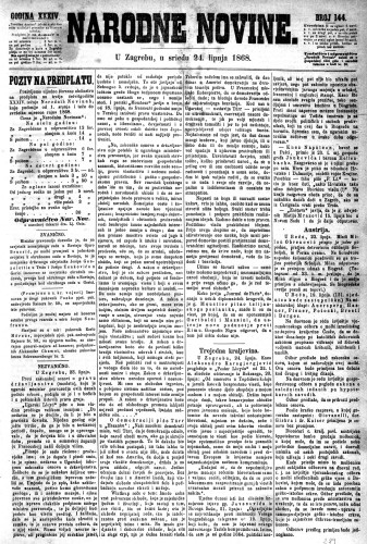 Narodne novine : 34,144(1868) / odgovorni urednik Ljudevit Gaj.