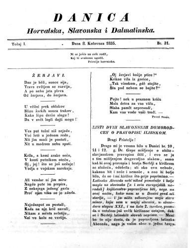 Danica horvatska, slavonska i dalmatinska : 1,31(1835) / redaktor Ljudevit Gaj.