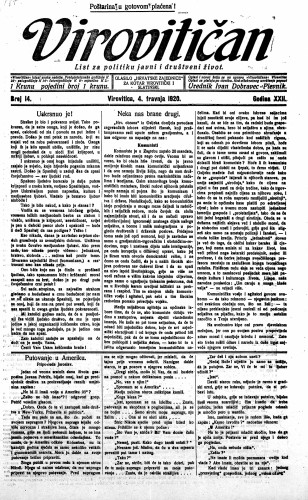 Virovitičan : glasilo Hrvatske zajednice za kotar Virovitički i Slatinski : list za politiku, javni i društveni život : 22,14(1920) / odgovorni urednik Ivan Dobravec-Plevnik.