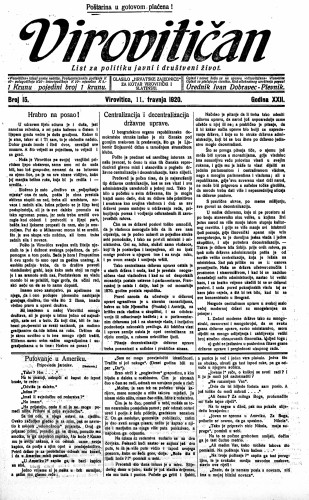 Virovitičan : glasilo Hrvatske zajednice za kotar Virovitički i Slatinski : list za politiku, javni i društveni život : 22,15(1920) / odgovorni urednik Ivan Dobravec-Plevnik.