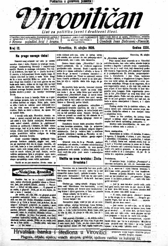 Virovitičan : glasilo Hrvatske zajednice za kotar Virovitički i Slatinski : list za politiku, javni i društveni život : 22,12(1920) / odgovorni urednik Ivan Dobravec-Plevnik.