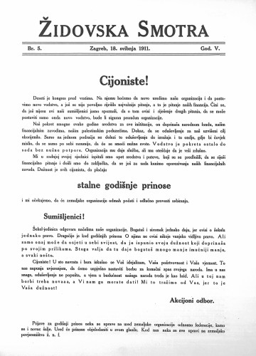 Židovska smotra : 5,1(1911) / odgovorni urednik Marko Bauer.